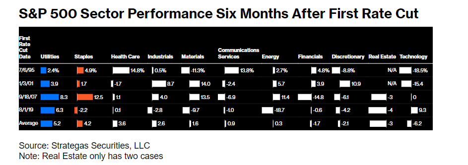 This positioning goes against the lessons of history. According to data compiled by Strategas Securities, in the past four interest rate cut cycles over the past thirty years, investors have pursued so-called defensive stocks such as utilities, consumer staple stocks, and healthcare stocks, which pay high dividends and are favored by investors when bond yields decline. Strategas data shows that in the six months following the initial rate cut in these four cycles, the best-performing industry was utilities, with an average increase of 5.2%. The technology sector performed the worst, dropping 6.2%, while real estate, consumer goods, and the financial sector also experienced significant declines.