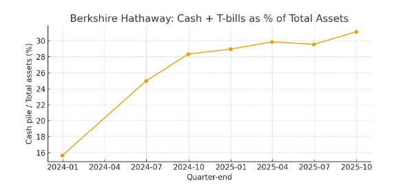 In the past two years, $Berkshire Hathaway-B (BRK.B.US)$ The scale of cash and short-term U.S. Treasuries has surged: from approximately $168 billion at the end of 2023, to $277 billion by mid-2024, and further to a record $381.7 billion in the third quarter of 2025. When viewed as a percentage of total assets, this trend becomes even clearer—cash accounted for about 15% of total assets in 2023, a moderate level, but has now risen to roughly one-third.