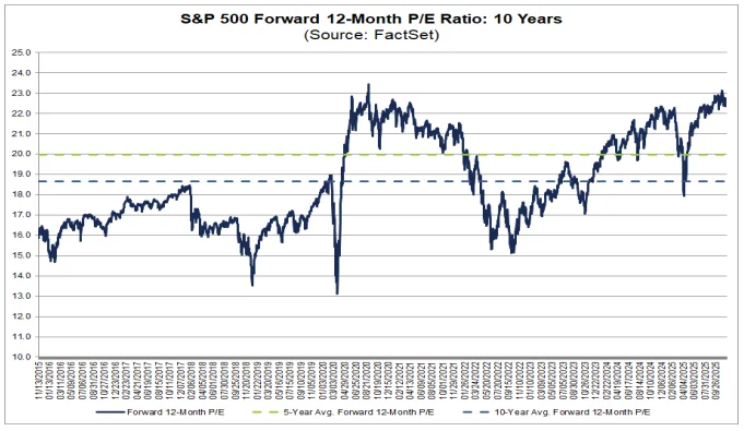 According to the latest Earnings Insight report released by FactSet,$S&P 500 Index (.SPX.US)$The forward price-to-earnings (P/E) ratio for the next 12 months is approximately 22–23 times, higher than its five-year average of 20 times and ten-year average of 18.7 times.