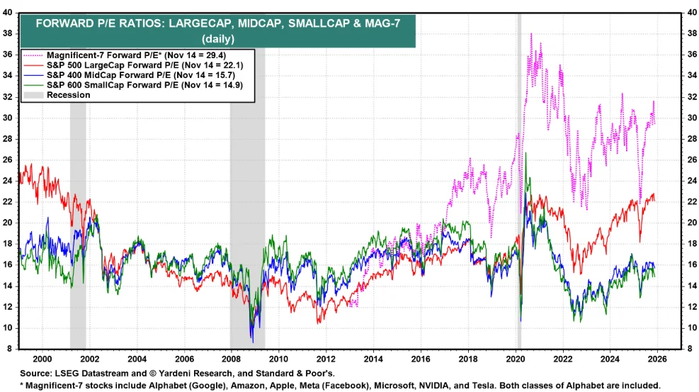 Meanwhile, the overall valuation multiples of the 'Magnificent Seven' are as high as approximately 29.4 times, significantly above the broader market level; in contrast, mid-cap and small-cap stocks are relatively inexpensive, with a P/E ratio of only about 15 times. In other words, the current valuation divergence is not between 'equities vs bonds,' but rather between 'the seven major technology giants vs all other companies.'