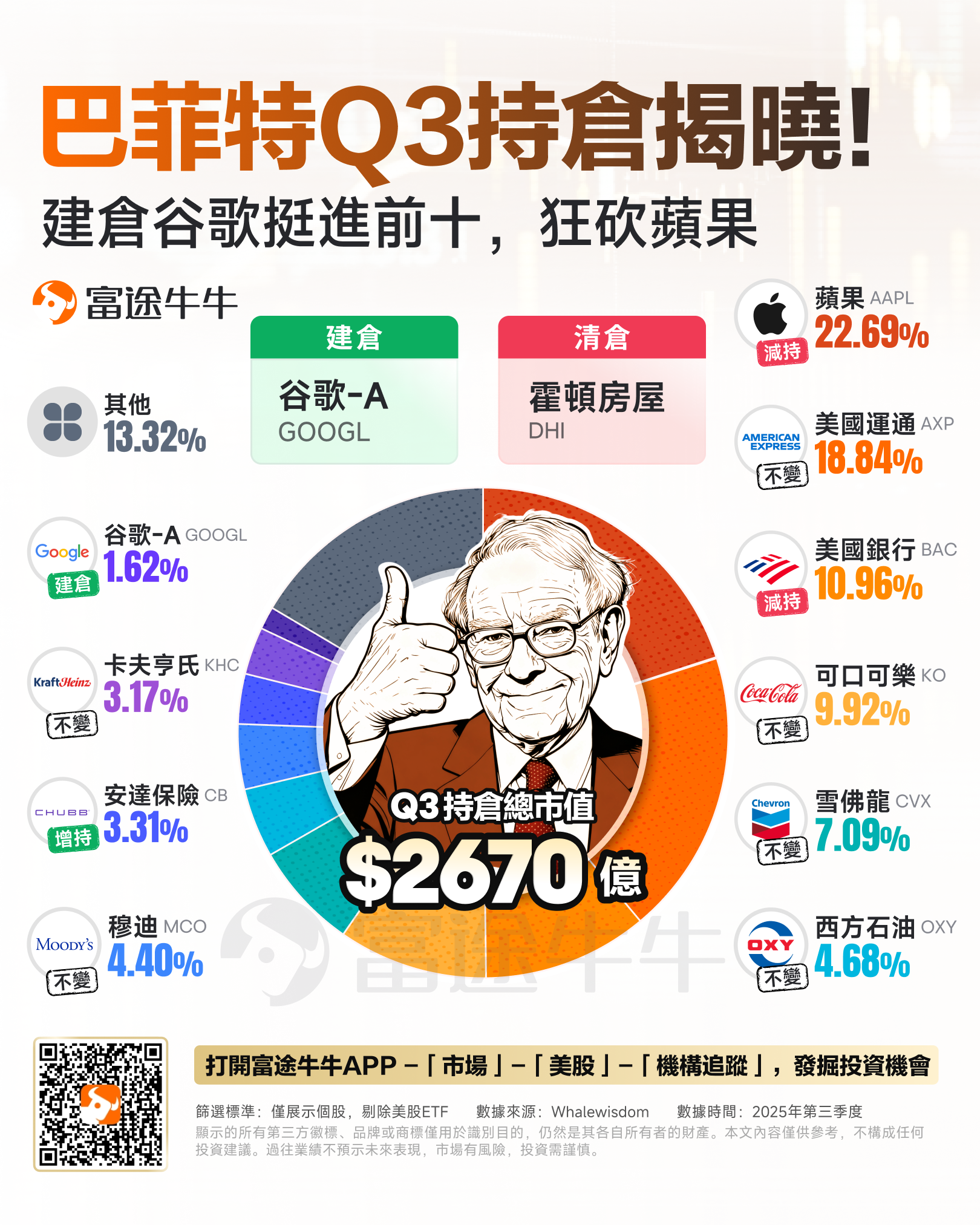 However, while setting a new record for the largest corporate cash reserve in history, Berkshire Hathaway did something unusual: it disclosed for the first time a holding worth $4.3 billion in $Alphabet-C (GOOG.US)$ , while reducing its stake in $Apple (AAPL.US)$ . Currently, Google has become one of Berkshire Hathaway's top ten holdings; Apple, though still its largest position, has seen its share count drop sharply from over 900 million shares at its peak to approximately 238 million shares.