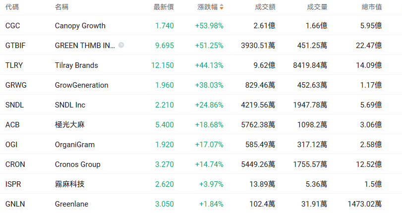 Cannabis producers$Tilray Brands (TLRY.US)$Surged 44%,$Canopy Growth (CGC.US)$Soared 53%. The Amplify Seymour Cannabis ETF skyrocketed over 54%, marking the fund's best single-day performance ever.