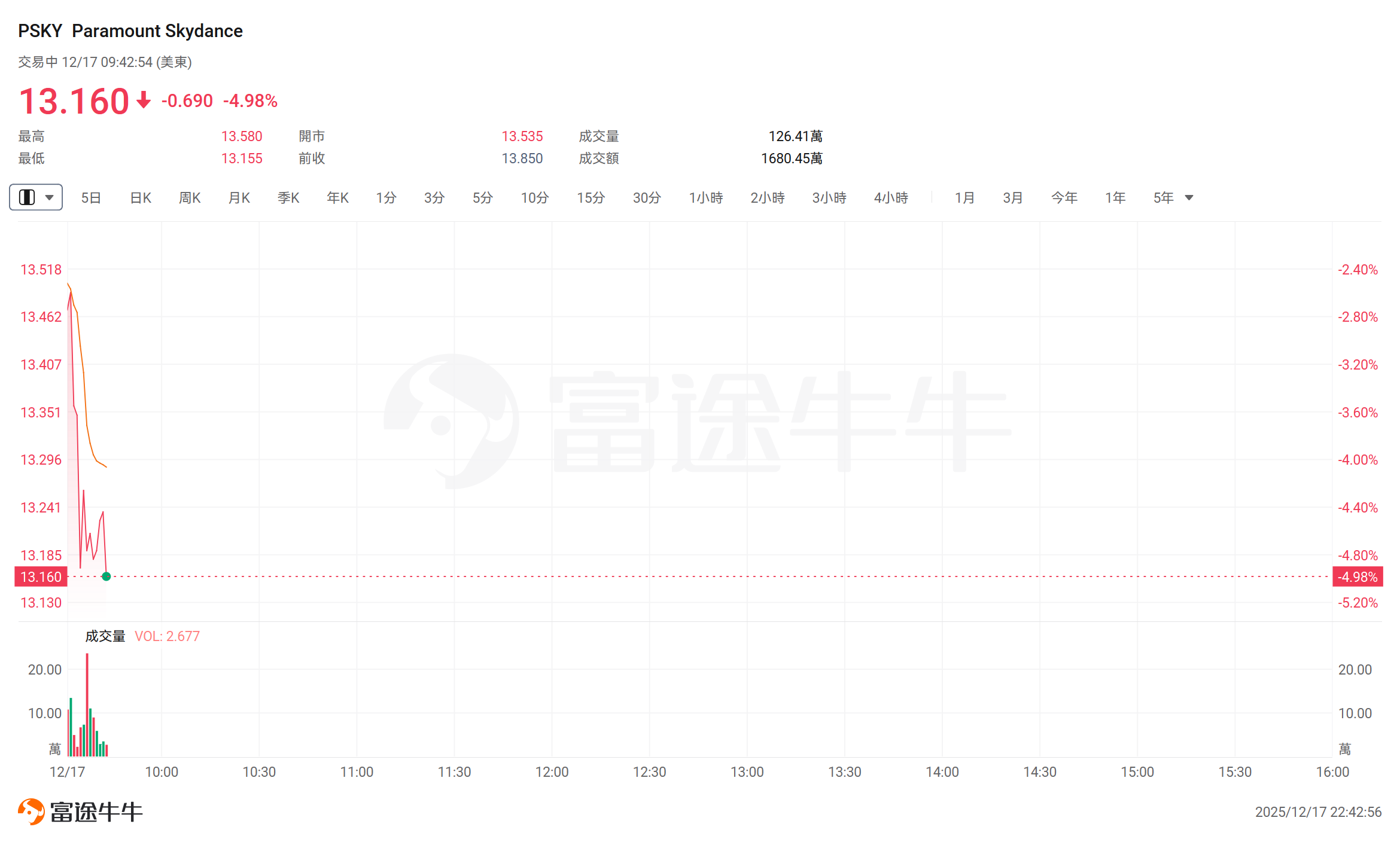 Today, $Paramount Skydance (PSKY.US)$ Dropped nearly 5%, currently trading at $13.16, with a turnover of $16.8045 million.