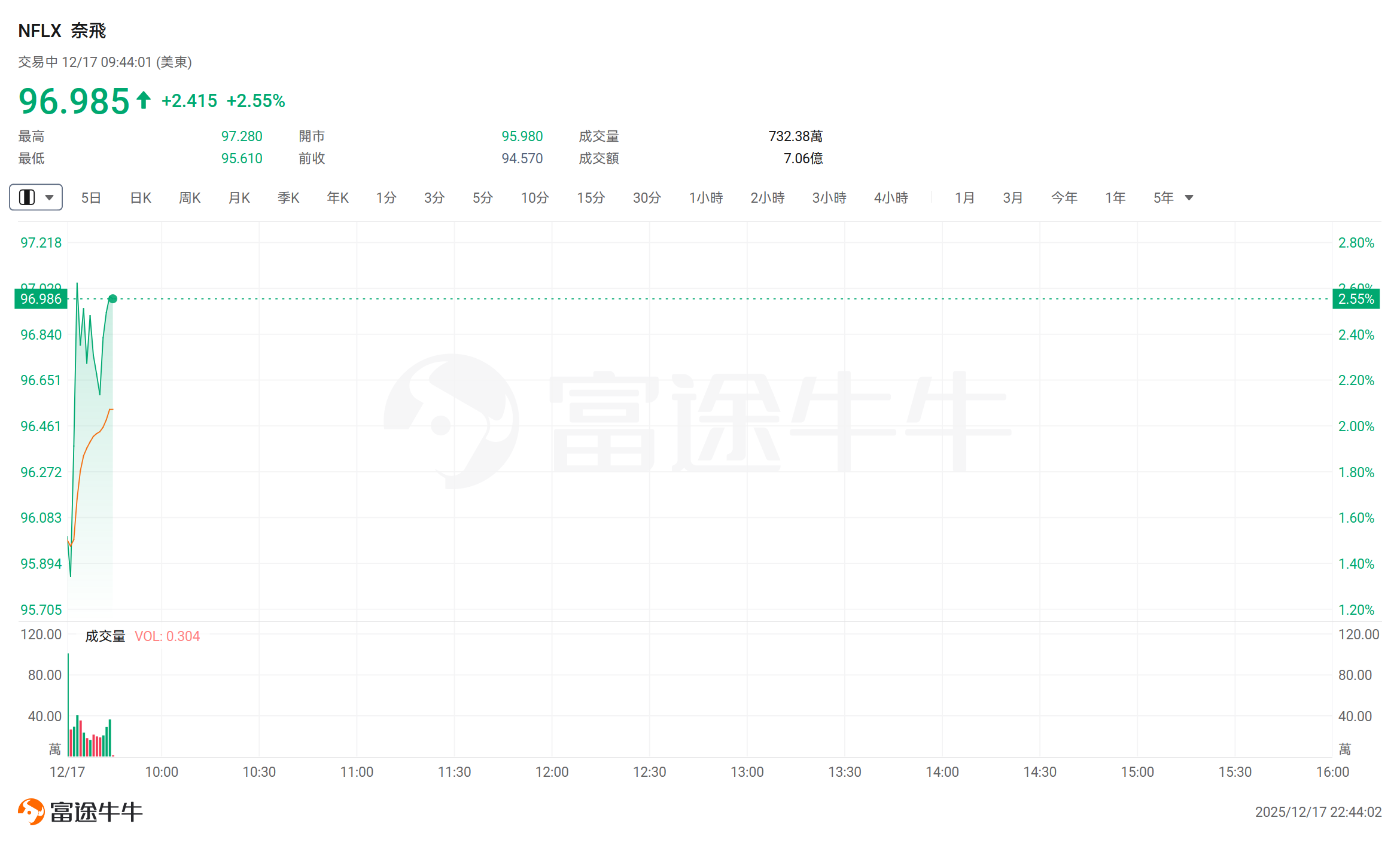 $Netflix (NFLX.US)$ Rose over 2%, last trading at $96.985.
