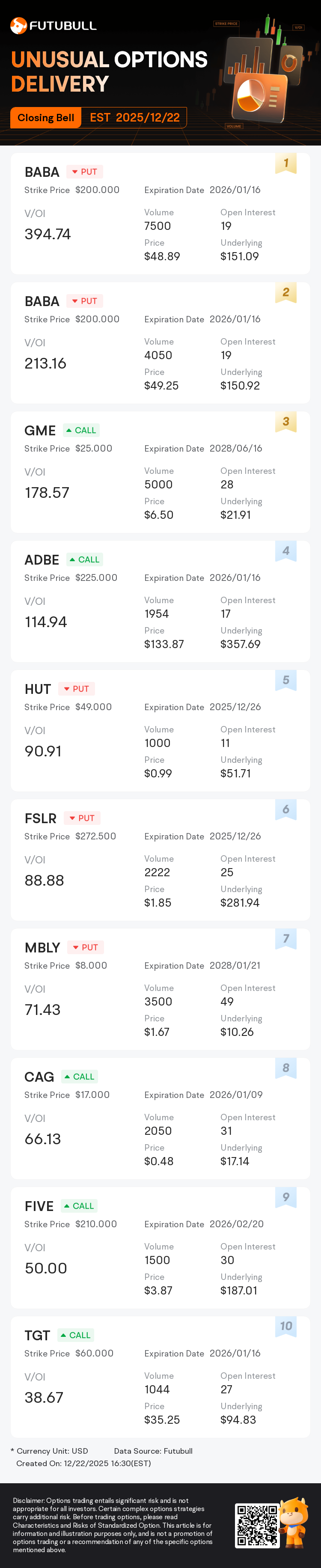 EST Dec 22nd Closing Delivery - In the last three hours of trading, 10 options with a high V/OI ratio were detected. With the market volatile, it's crucial to stay informed on the latest options trends.