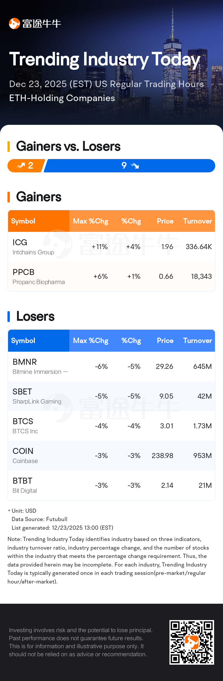 December 23rd - The industry of $ETH-Holding Companies (LIST23775.US)$ is trending down in regular trading hours with 2 constituents up, 9 constituents down and Bitmine Immersion Technologies leading Losses.