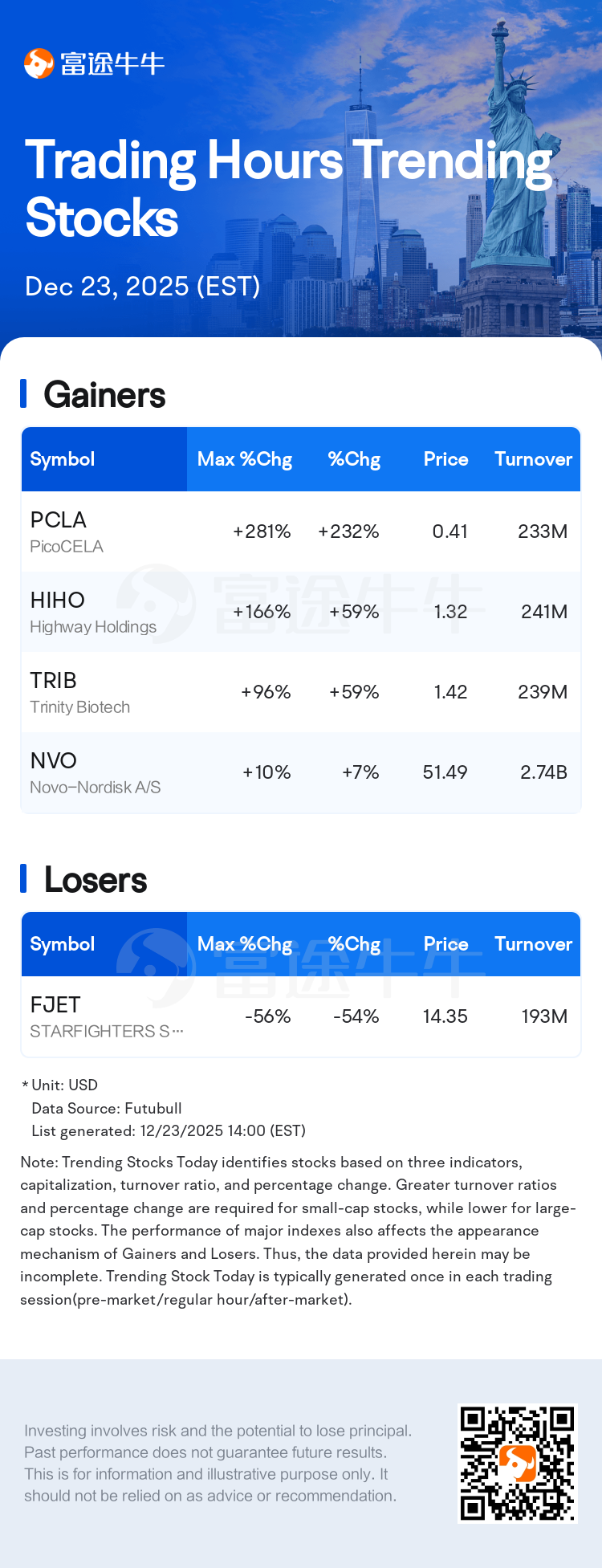 Trending Stocks Today identifies stocks based on three indicators, capitalization, turnover ratio, and percentage change. Greater turnover ratios and percentage change are required for small-cap stocks, while lower for large-cap stocks. The performance of major indexes also affects the appearance mechanism of Gainers and Losers. Thus, the data provided herein may be incomplete. Trending Stock Today is typically generated once in each trading session(pre-market/regular hour/after-market).