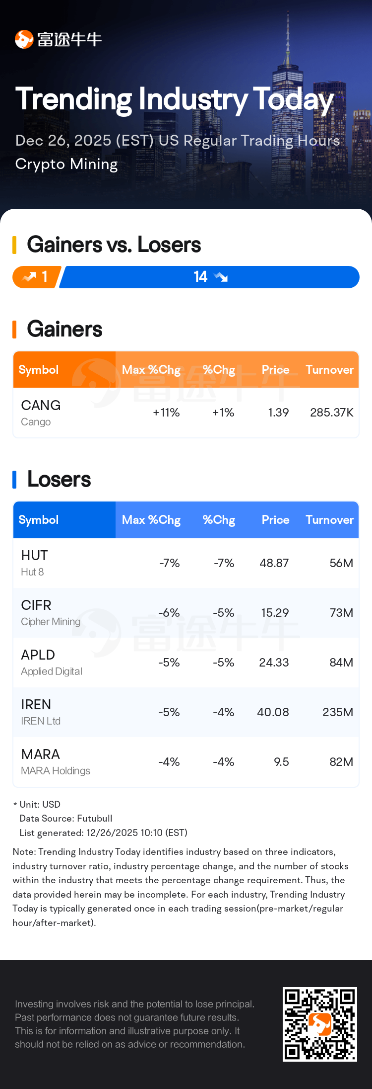 December 26th - The industry of $Crypto Mining (LIST23921.US)$ is trending down in regular trading hours with 1 constituents up, 14 constituents down and Hut 8 leading Losses.
