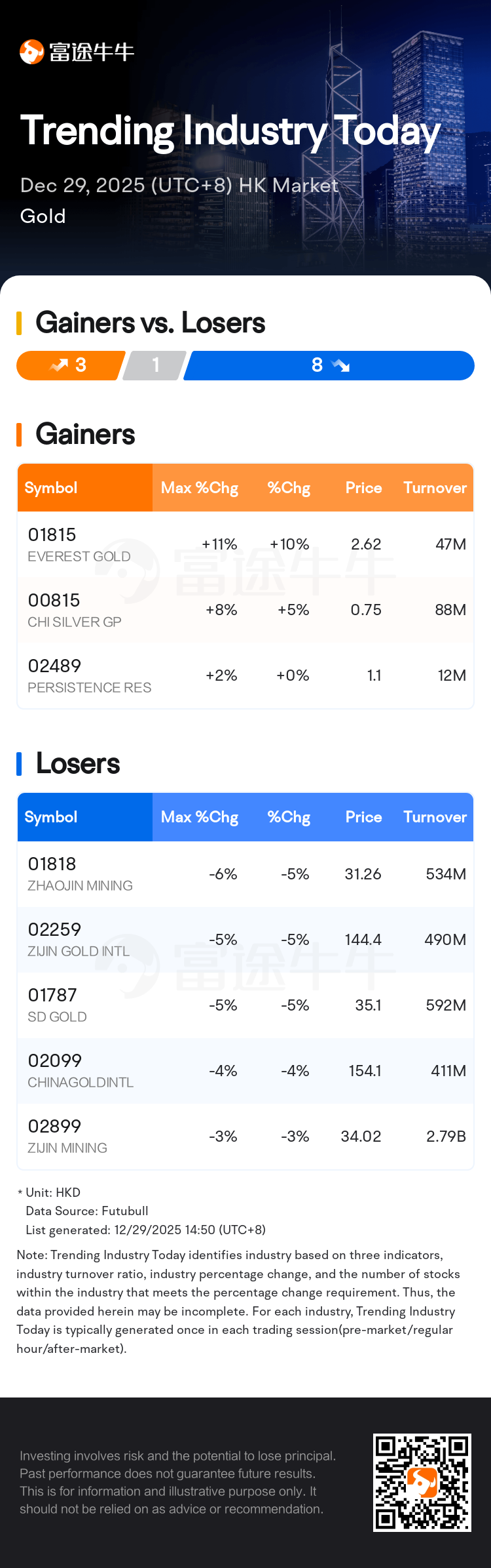 December 29th - The industry of $Gold (LIST1222.HK)$ is trending lower today with 3 constituents up, 8 constituents down and ZHAOJIN MINING leading Losses.