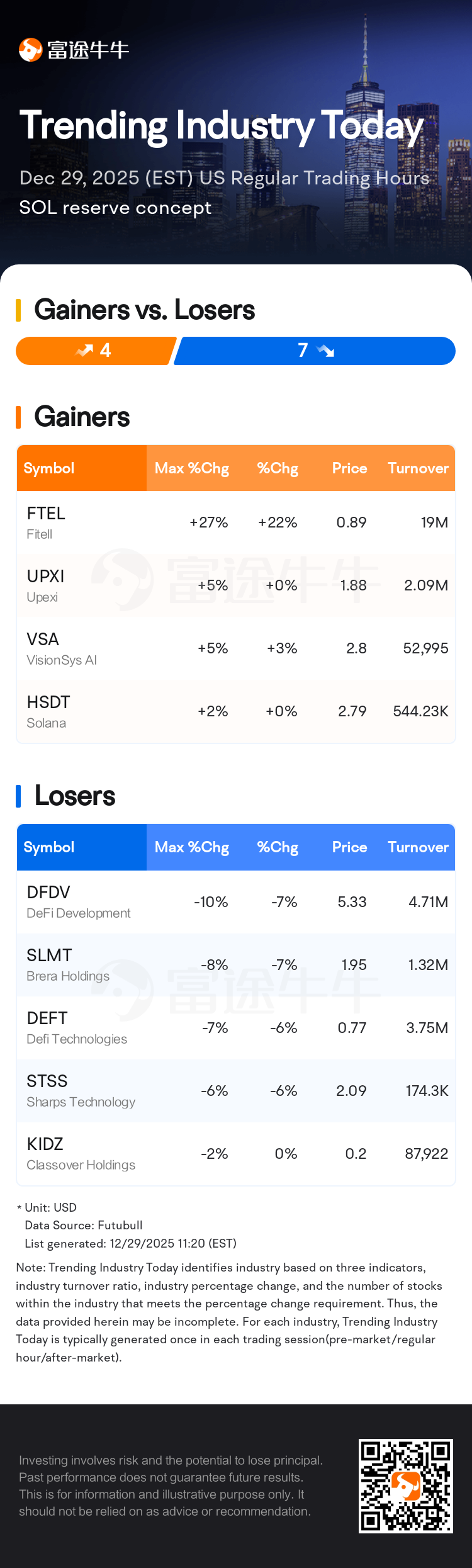 December 29th - The industry of $SOL reserve concept (LIST23797.US)$ is trending down in regular trading hours with 4 constituents up, 7 constituents down and DeFi Development leading Losses.