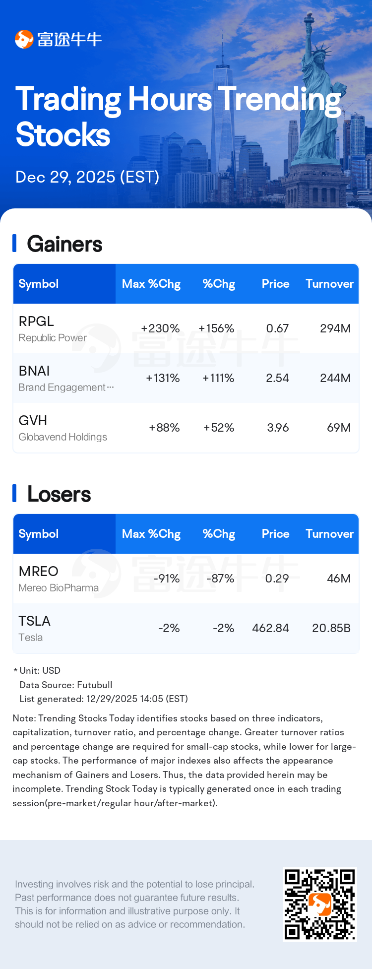 Trending Stocks Today identifies stocks based on three indicators, capitalization, turnover ratio, and percentage change. Greater turnover ratios and percentage change are required for small-cap stocks, while lower for large-cap stocks. The performance of major indexes also affects the appearance mechanism of Gainers and Losers. Thus, the data provided herein may be incomplete. Trending Stock Today is typically generated once in each trading session(pre-market/regular hour/after-market).