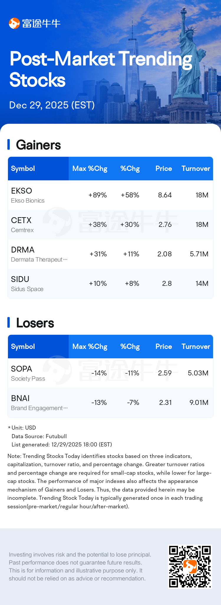 $Ekso Bionics (EKSO.US)$ soars 58.24% to $8.64 with a turnover of $18.02 million.