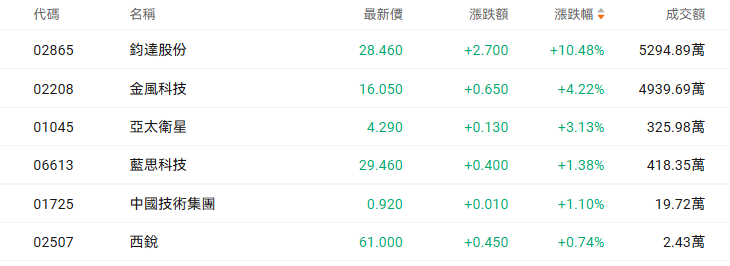 Hong Kong-listed commercial aerospace stocks rose again, $DRINDA (02865.HK)$ Increase by more than 10% again, $GOLDWIND (02208.HK)$ rose more than 4%, $APT SATELLITE (01045.HK)$ with some rising over 3%, $LENS (06613.HK)$ Surged over 1%.