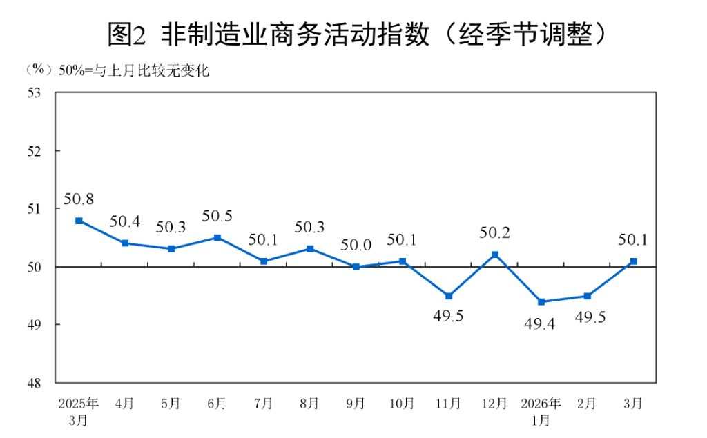 In March, the non-manufacturing business activity index stood at 50.1%, up by 0.6 percentage points from the previous month and above the critical threshold, indicating an improvement in the non-manufacturing sector's business climate.