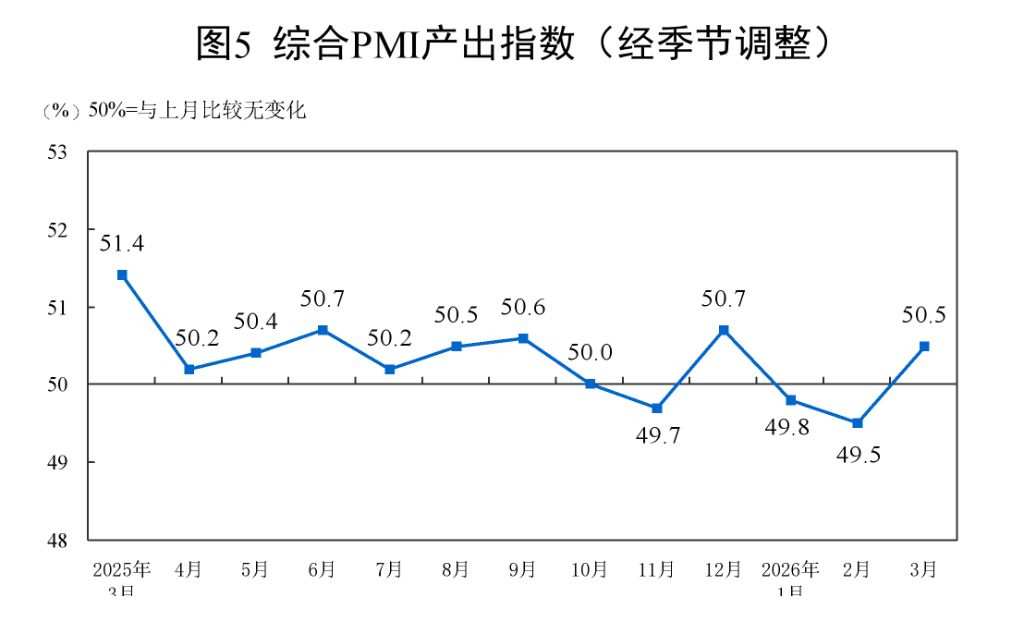 Huo Lihui, Chief Statistician of the Service Sector Survey Center of the National Bureau of Statistics, stated that the Manufacturing Production Index and the Non-Manufacturing Business Activity Index, which constitute the Composite PMI Output Index, were 51.4% and 50.1%, respectively.