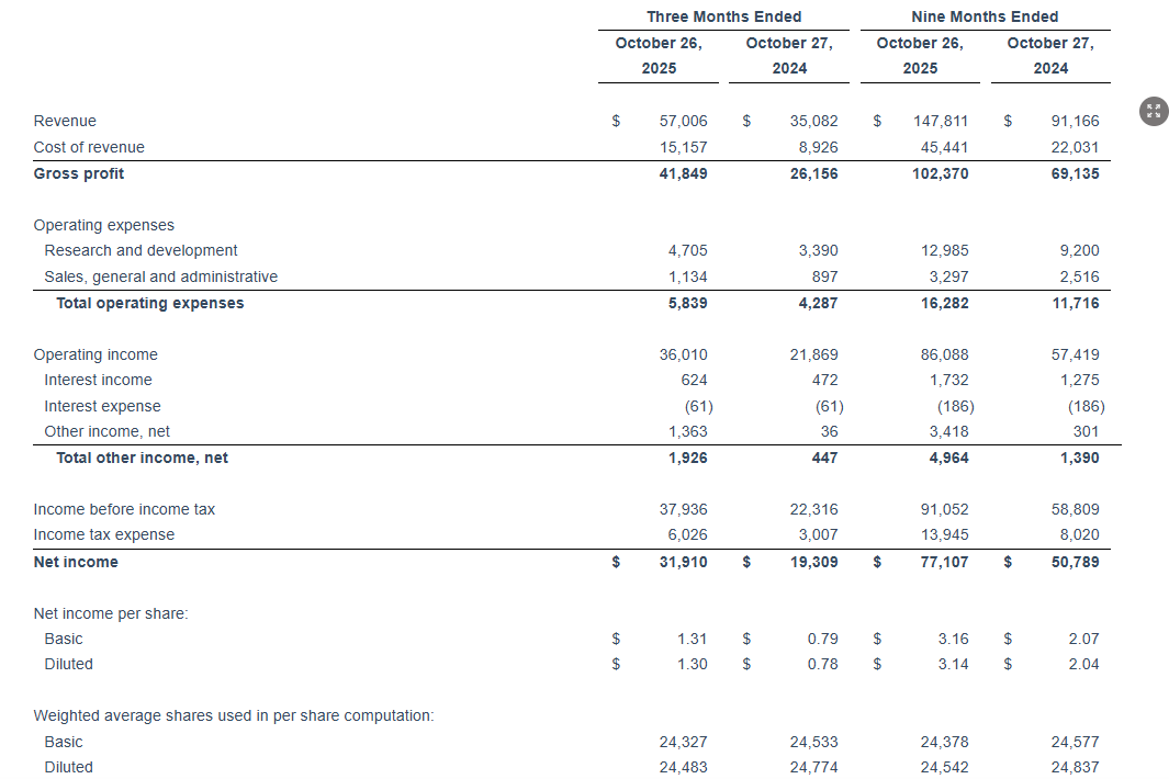$英伟达 (NVDA.US)$ 2026财年Q3营收570.06亿美元,同比增长62%,市场预期552.12亿美元;净利润319.10亿美元,同比增长65%;调整后每股收益1.30美元。