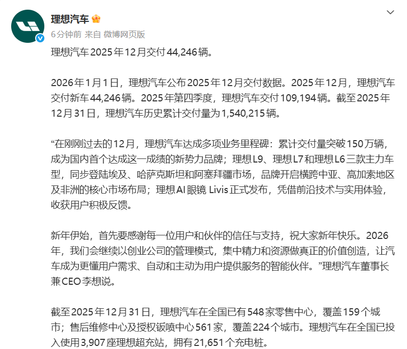 理想汽车2025年12月交付44,246辆汽车,截至2025年12月31日,理想汽车累计交付量已达1,540,215辆。