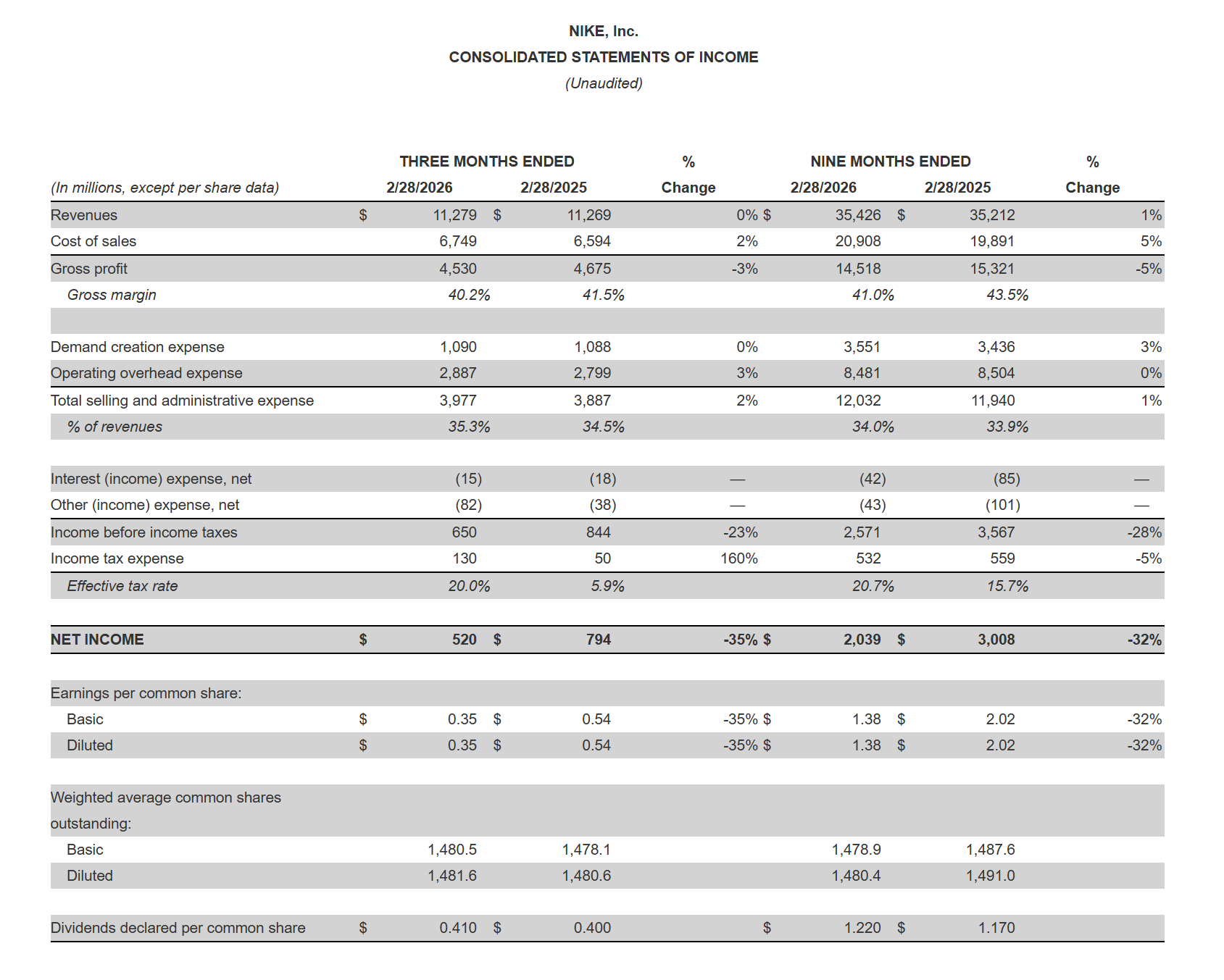耐克品牌营收 110 亿美元,财报口径增长 1%,固定汇率口径下滑 2%;主要因欧洲、中东、非洲地区及大中华区营收走低,北美市场增长形成部分对冲。