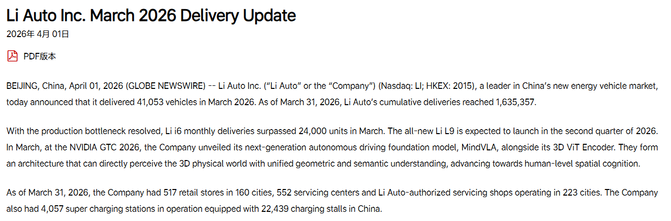 理想汽车:3月交付41053辆汽车,截至3月31日,累计交付量已达1635357辆。