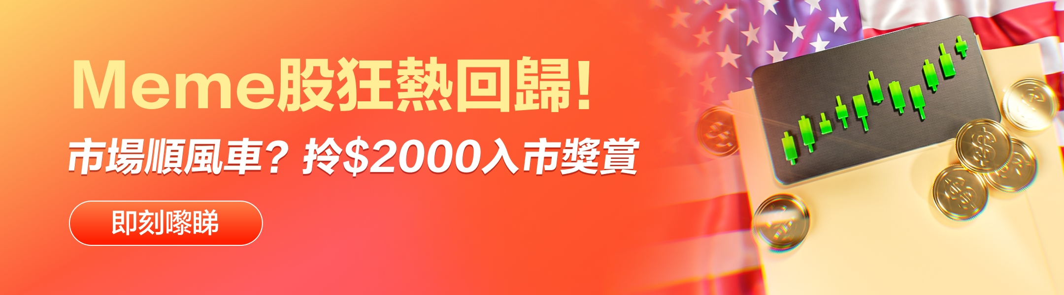 Meme股再現炒風,想輕鬆搭上市場順風車,富途5x24小時美股交易,方便隨時彈入彈出,送你價值$200加碼卡券開啟投資大計,疊加新客禮拎高達$2000獎賞,即拎>>
