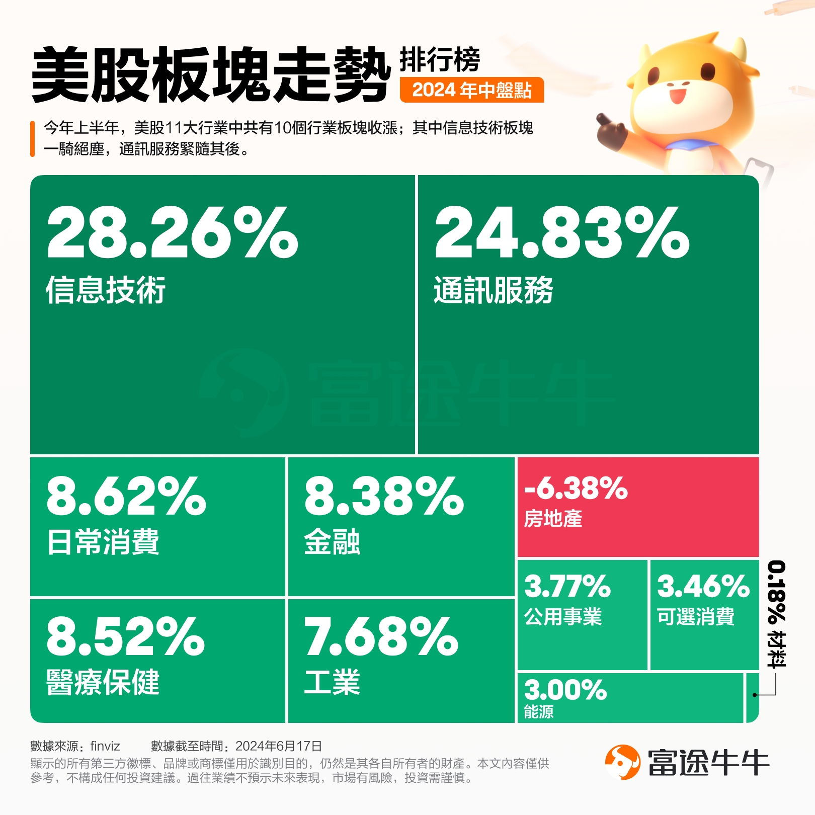 從上半年的收益來看,據統計,截至6月17日,信息技術板塊漲幅在各大主要板塊中居首,累計上漲28%;通訊服務板塊緊隨其後,累計漲近25%。