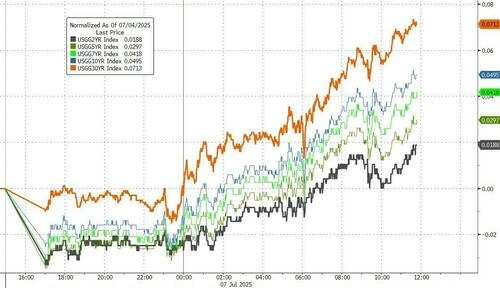 財聯社7月8日訊(編輯 瀟湘)在結束了上週末「獨立日」假期的小長假後,美債價格週一普遍走軟,其中長債收益率普遍走高,因美國關稅鬧劇波瀾再起,令不少投資者喚起了4月「解放日」對等關稅後美債市場慘遭拋售的回憶。