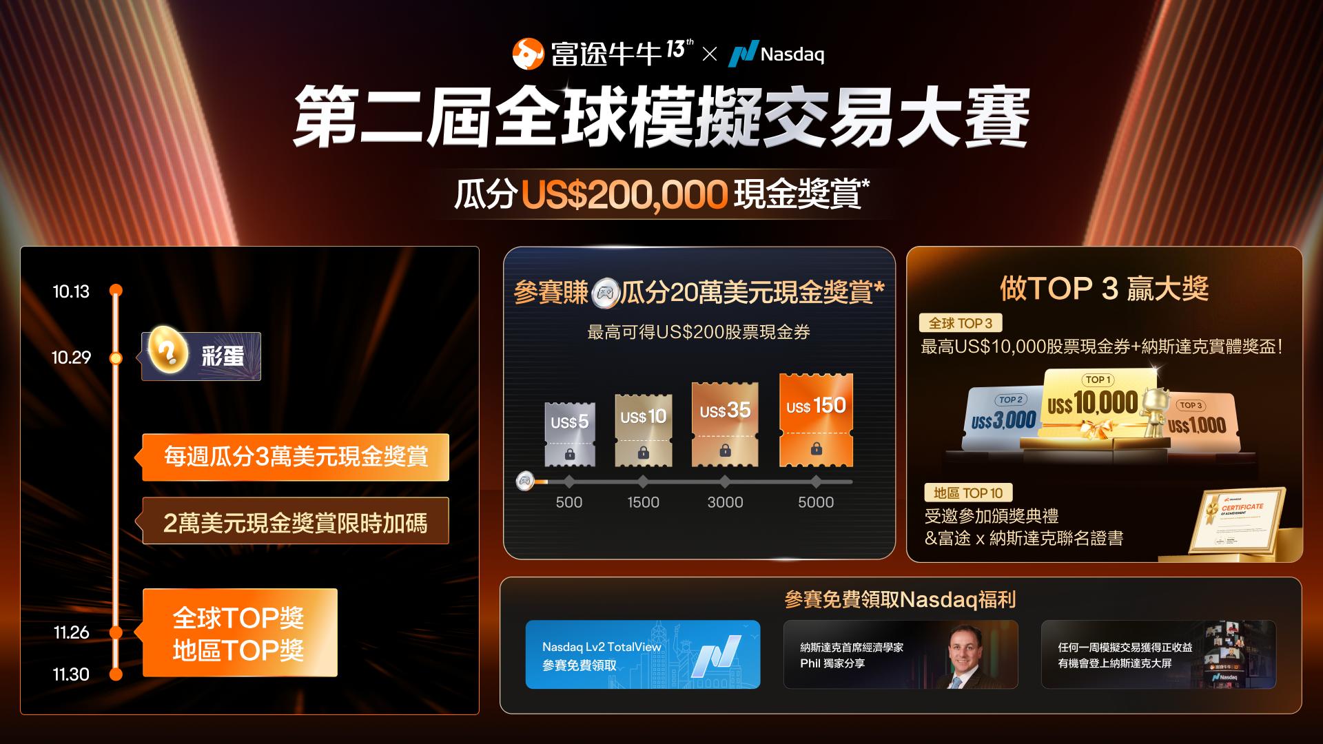 富途13週年,感恩牛友們的一路相伴!10月13日至11月22日,我們推出第二屆全球模擬交易大賽,瓜分最高20萬美元獎池