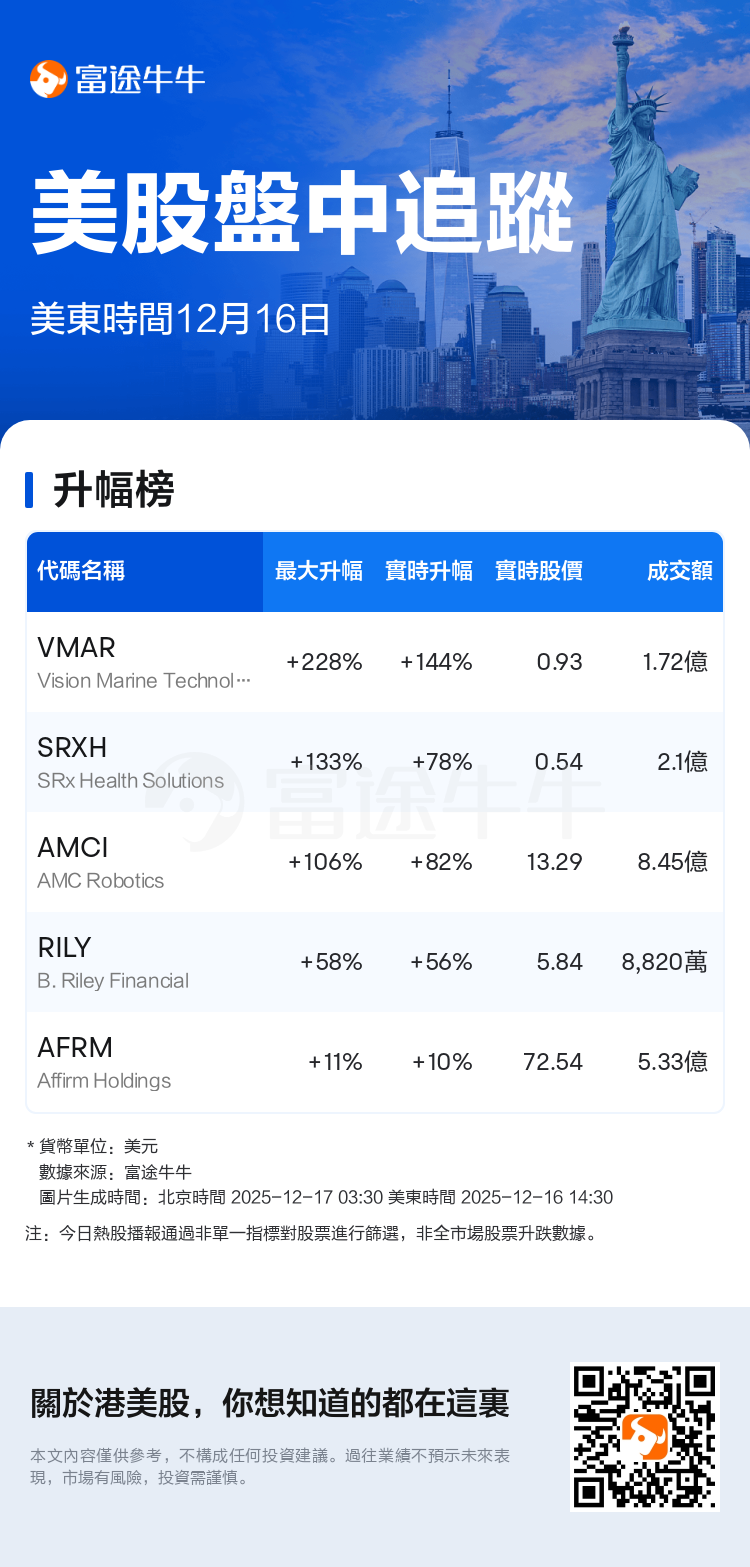 美東時間12月16日報道,以下為今日美股盤中熱門個股。