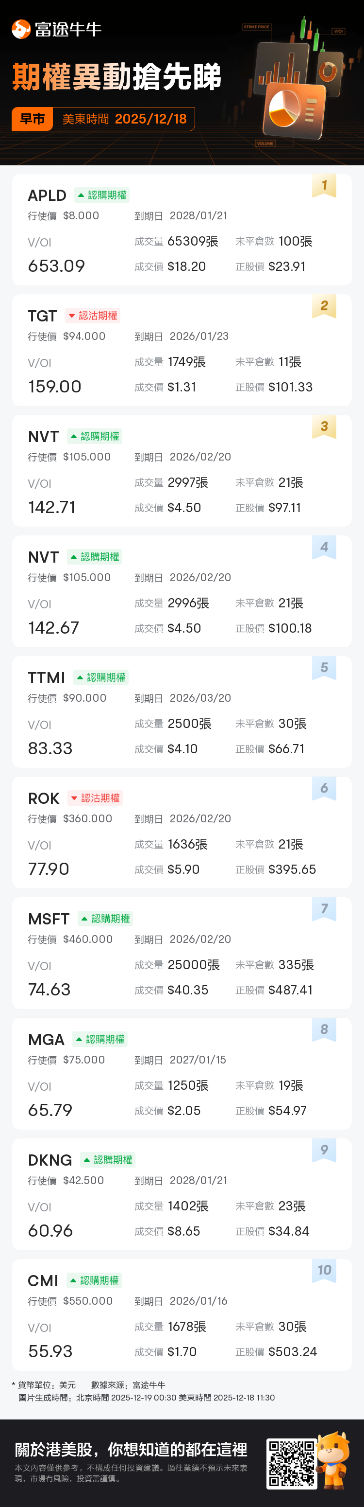 若在對應時段有超過3筆V/OI≥10的交易,將在美東時間11:30、13:30和16:30各生成一篇期權異動資訊。