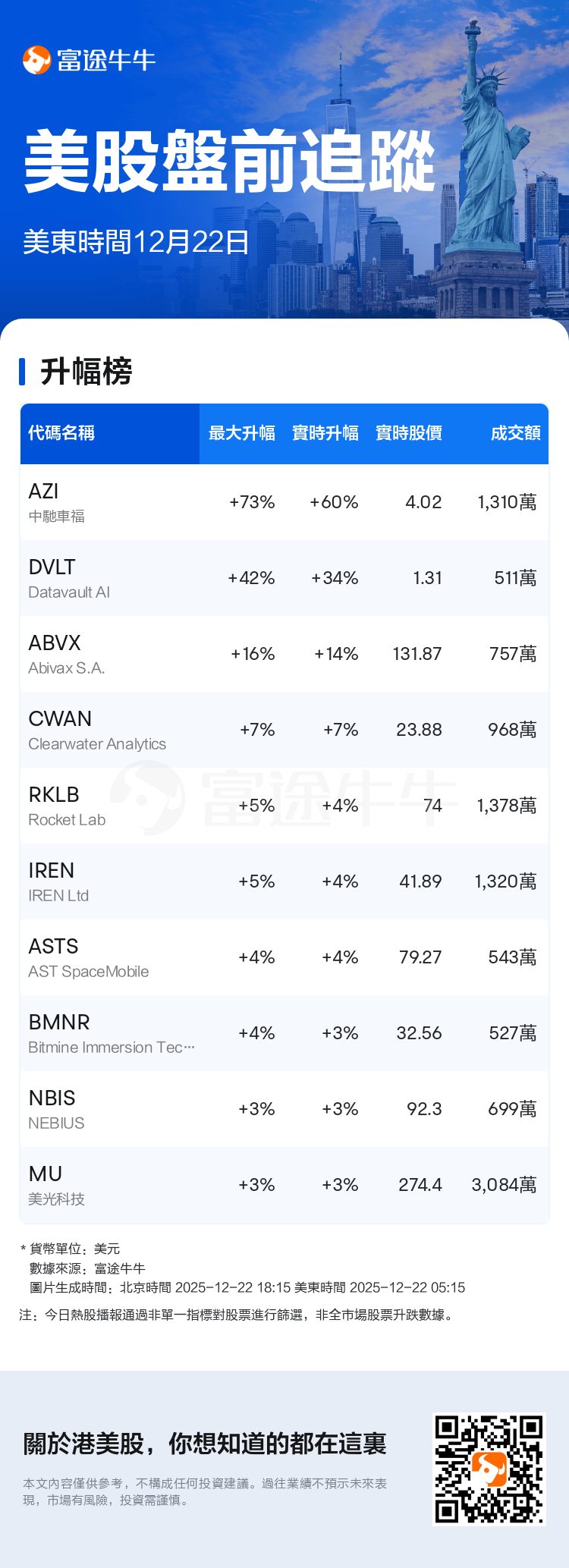 $中馳車福 (AZI.US)$一度升73.99%,現升60.8%,報4.02美元,成交額達1,310.63萬美元。