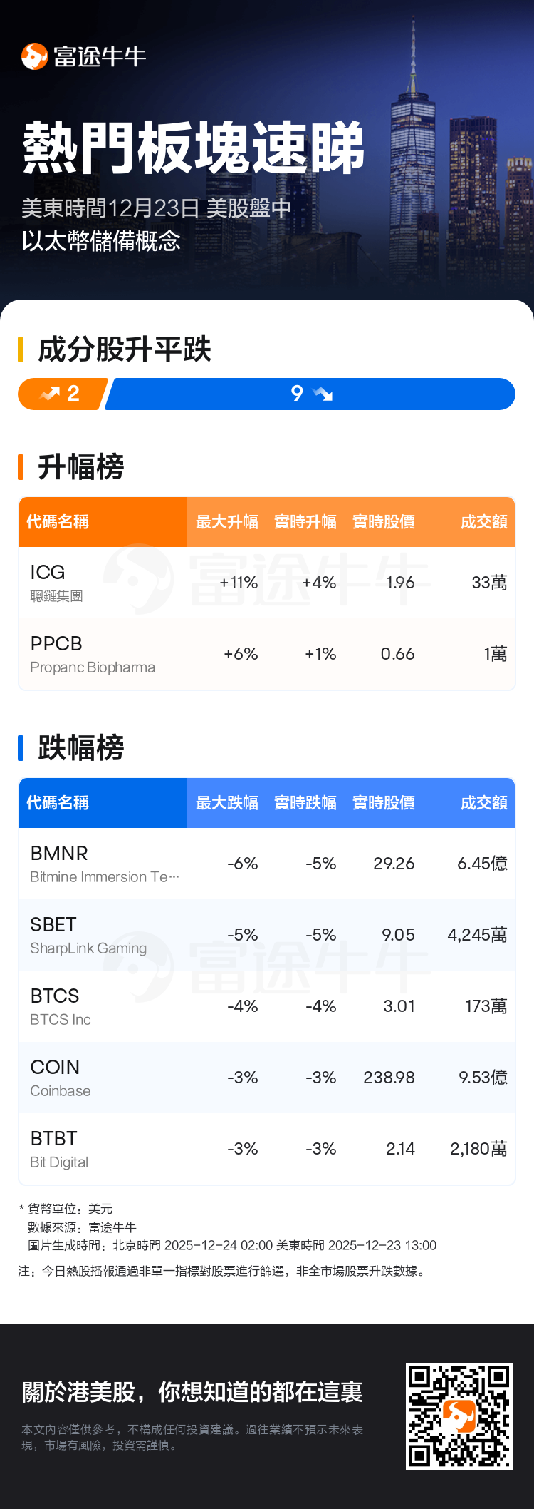 美東時間12月23日報道,今日美股盤中$以太幣儲備概念 (LIST23775.US)$走勢疲弱,截至發稿,板塊中2只成份股上升,9只成份股下跌,Bitmine Immersion Technologies領跌板塊。