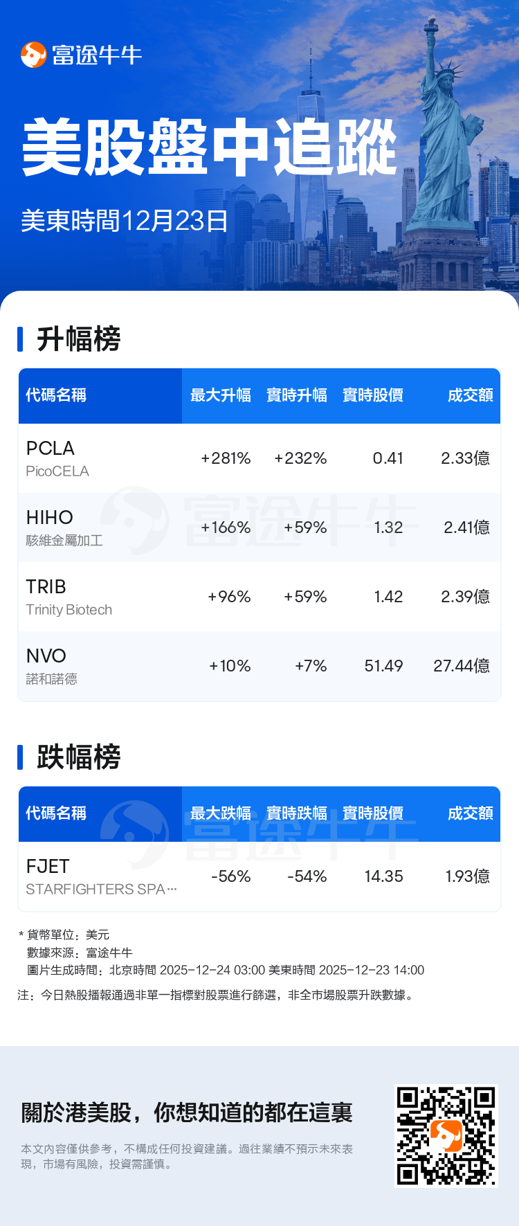 美東時間12月23日報道,以下為今日美股盤中熱門個股。