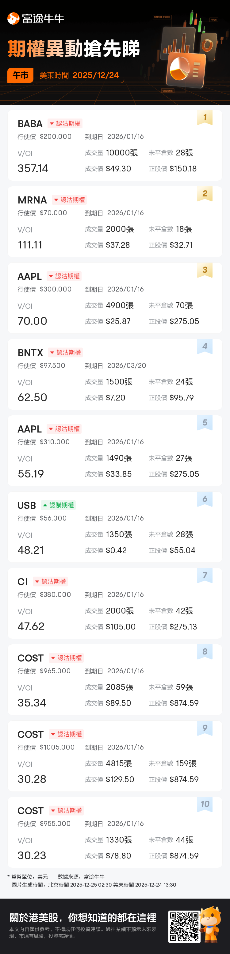 美東時間12月24日報導,午市時段,過去2小時有10筆期權大單值得關注。