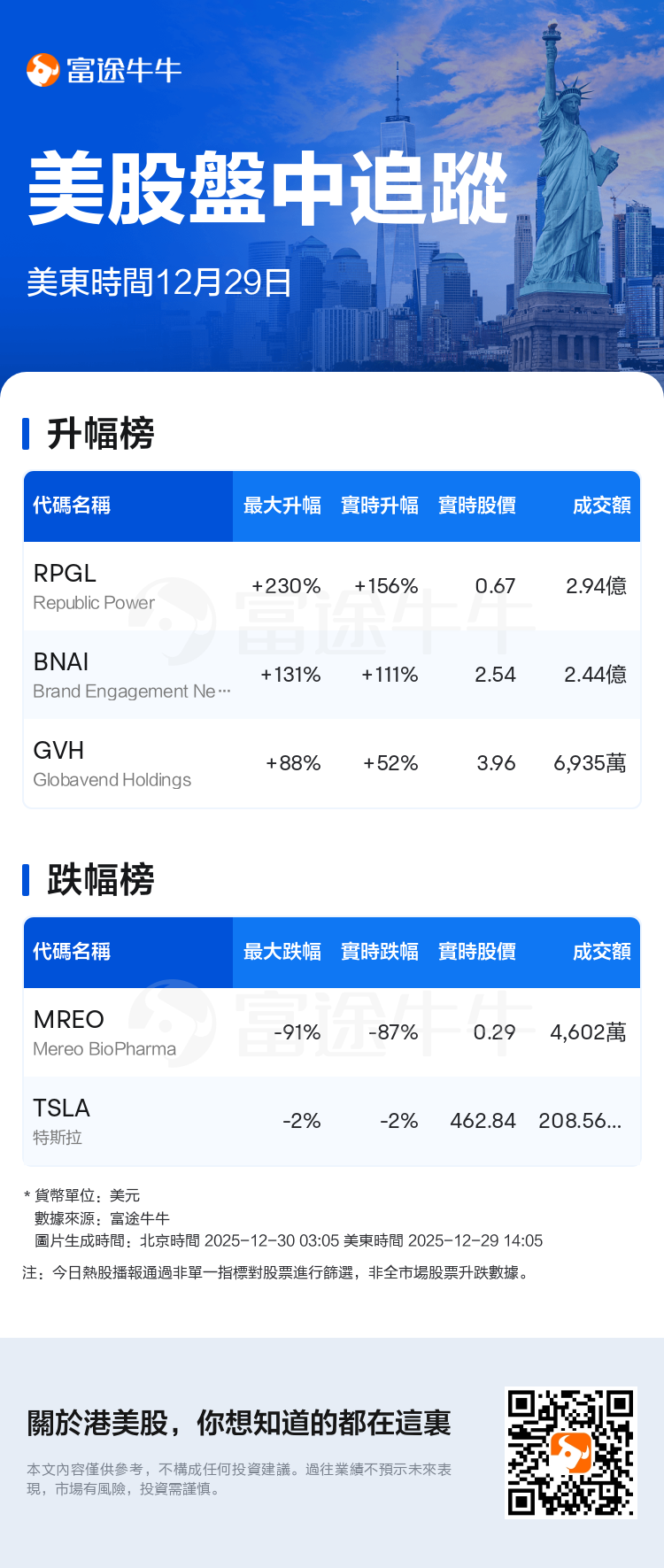 美東時間12月29日報道,以下為今日美股盤中熱門個股。