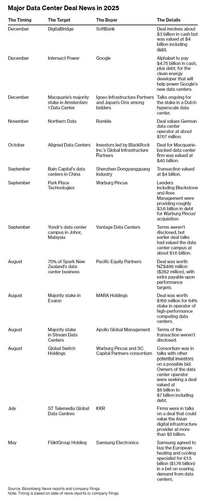 週一,$軟銀集團 (9984.JP)$成爲最新加入戰局的企業,宣佈與數字基礎設施投資商 $DigitalBridge Group (DBRG.US)$ 達成價值數十億美元的收購協議,這也推動了今年全球數據中心併購交易額突破700億美元。以下爲今年數據中心相關併購交易動態一覽。