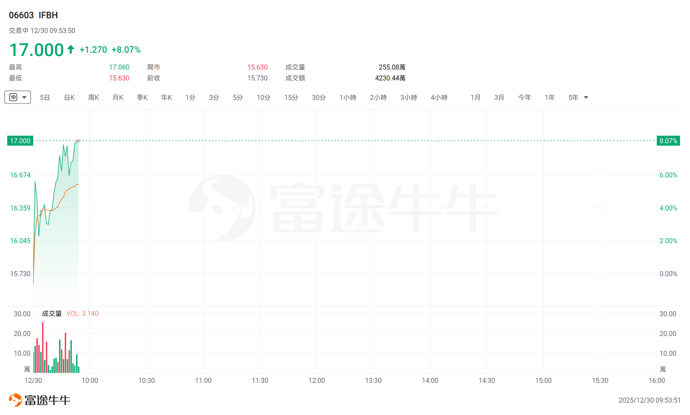 今日, $IFBH (06603.HK)$ 漲超8%,截至發稿,漲8.07%,報17港元,成交額4230.44萬港元。