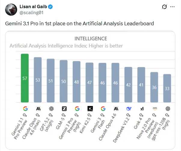 第三方機構Artificial Analysis的測試也顯示,Gemini3.1 Pro的綜合智能指數已經悄悄爬到了第一,把Claude Opus 4.6甩在了身後。
