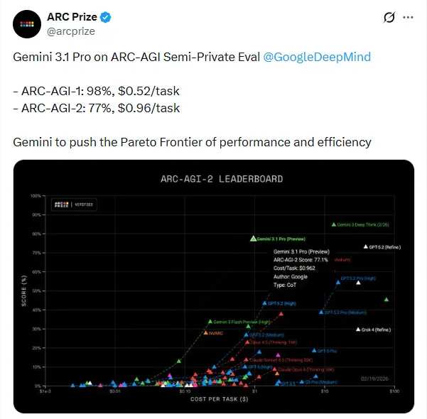 Gemini 3 Pro之前的得分是31.1%,而Gemini3.1 Pro一口氣衝到了77.1%。谷歌DeepMind的老闆戴密斯·哈薩比斯(Demis Hassabis)也特地發文說,這標誌着模型在覈心推理和問題解決能力上有了重大改進。