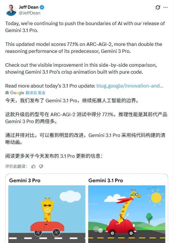 谷歌DeepMind的首席科學家傑夫·迪恩(Jeff Dean)也站出來力挺,他放出了一個並排對比視頻,展示Gemini3.1 Pro生成的動畫明顯比上一代更清晰、更流暢。