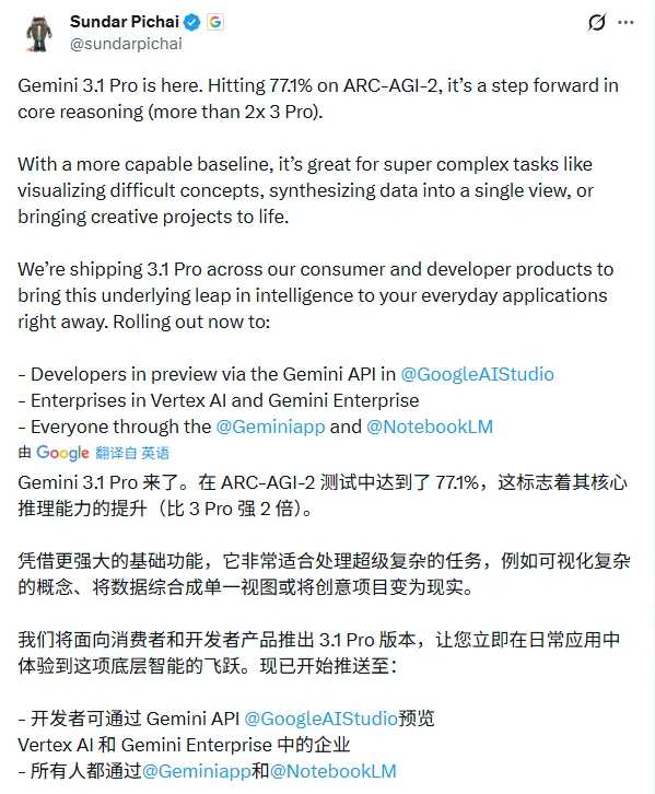 谷歌CEO桑達爾·皮查伊(Sundar Pichai)親自下場,強調了這次在覈心推理能力上的翻倍提升,並表示新模型非常適合處理那些「將創意項目變爲現實」的複雜任務。