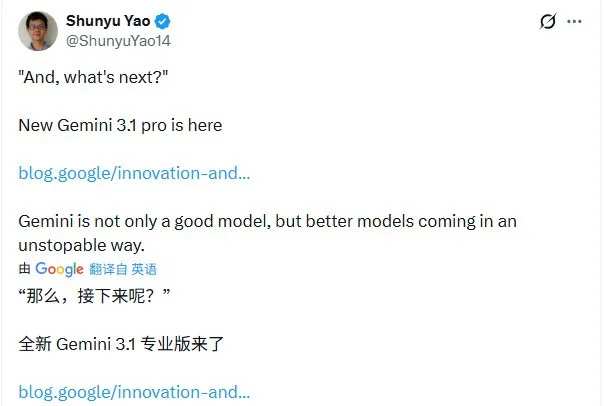 值得一提的是,此前參與了Gemini 3 Deep Think研究的姚順宇也在社交平台上介紹了這項新突破。他特別提到,這次的升級只是開始,「後續還會有更好的模型持續推出」。