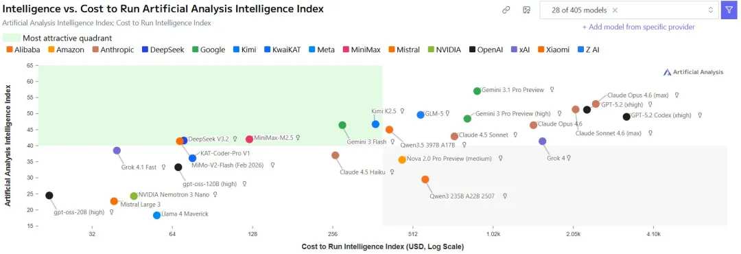 最讓人意外的是定價。Gemini 3.1 Pro保持了和Gemini3 Pro完全一樣的價格:輸入每百萬tokens 2美元起,輸出每百萬tokens 12美元起。Artificial Analysis算了一筆賬:跑完他們整個智能指數測試集,Gemini 3.1 Pro的花費還不到Claude Opus 4.6的一半。