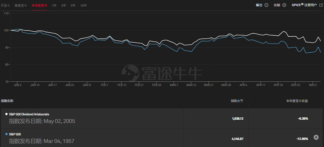 不足之处是,以3年、5年和10年的维度看,标普红利贵族指数表现略逊于标普500指数,但今年情况出现反转。年初至今,标普500指数跌12.99%,标普 500 红利贵族指数、标普全球红利贵族指数和标普高收益红利贵族指数收益分别为-6.38%、-3.49%、-3.02%,均好于标普500指数。