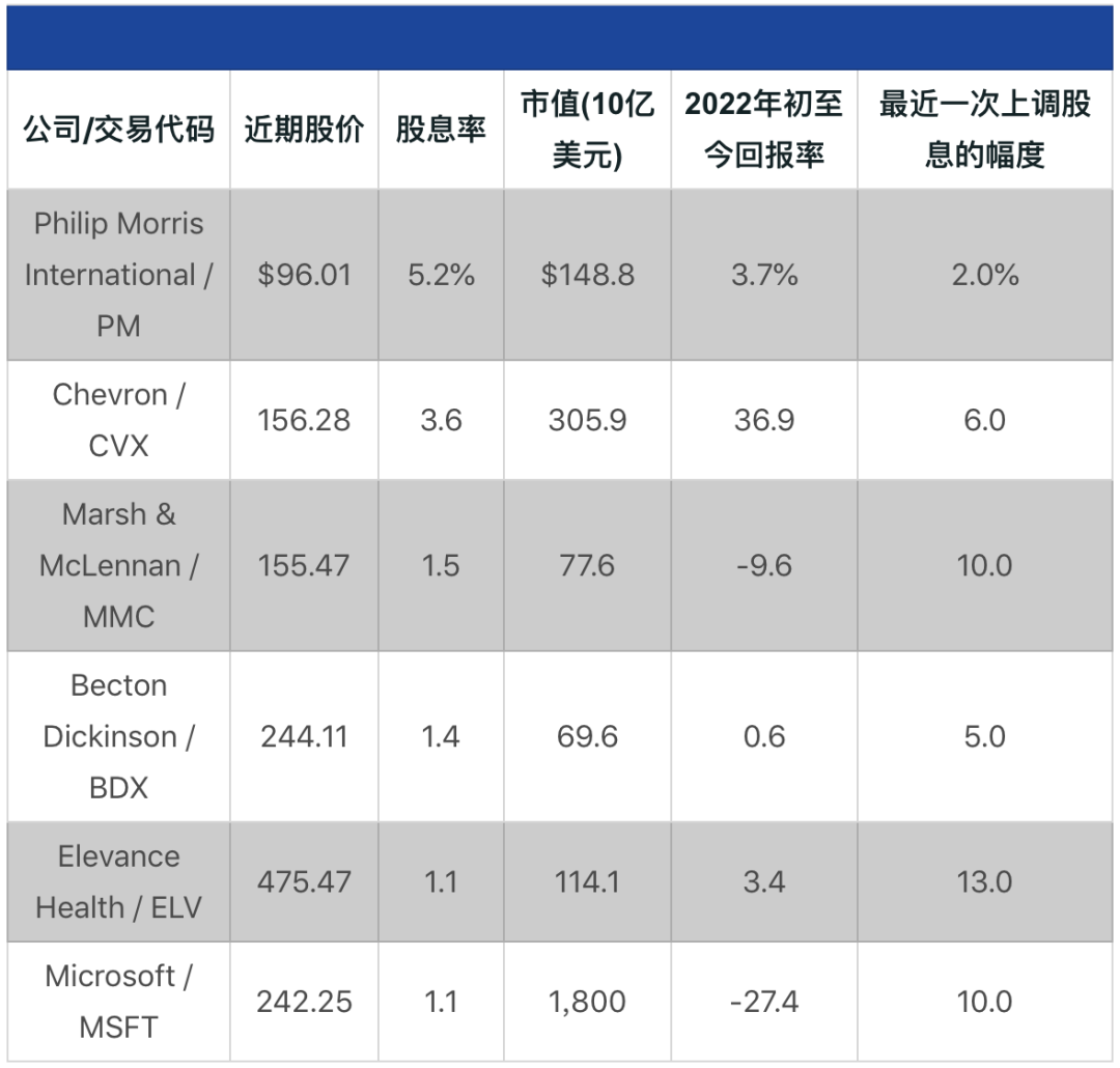 虽然美联储计划继续加息、经济增长速度会在美联储抗击通胀的过程中放缓,但营收具有弹性的公司仍在增加派息。标普道琼斯指数(S&P Dow Jones Indices)高级指数分析师霍华德·西尔弗布拉特(Howard Silverblatt)估计,即使标普500指数成份股公司的盈利增幅下降,该指数今年的整体派息仍有望增长10%。这将标志着标普500指数股息自2015年以来首次出现两位数增长。