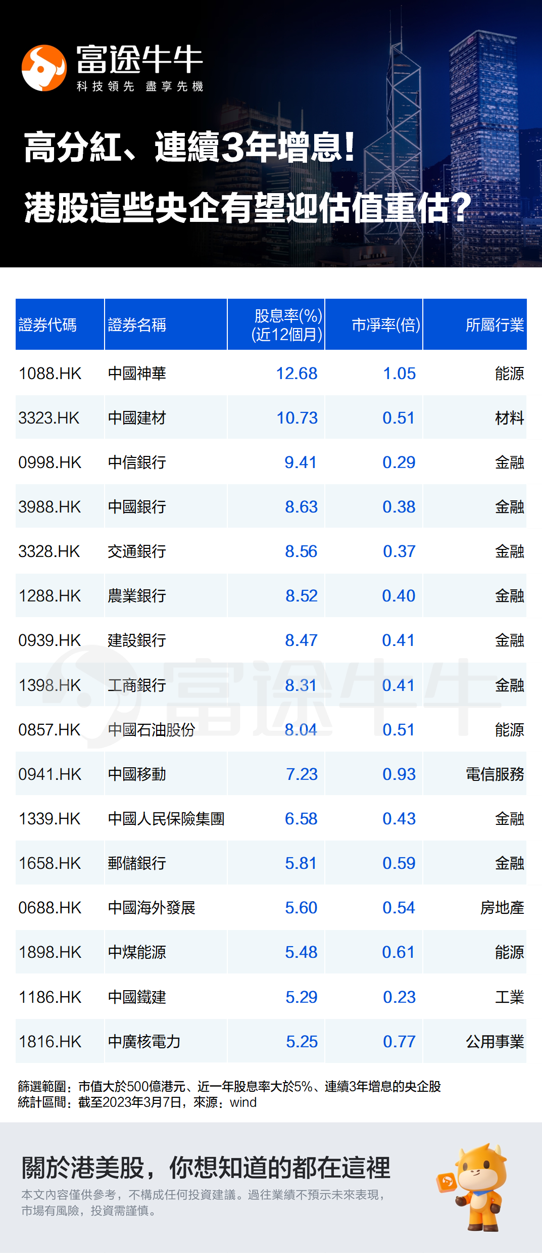 为此,要闻君梳理了近一年股息率靠前、且近三年来连续增加派息的港股低估值央企标的,供牛友参考。