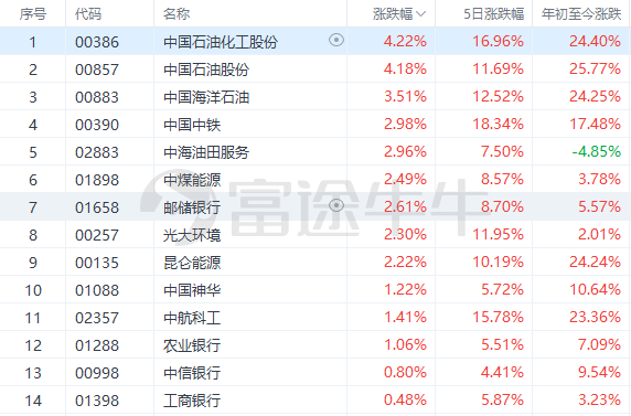 富途牛牛$港股央企 (BK1341.HK)$板块已连续5个交易日上涨,本月至今累涨超6%。其中,多只成本股近5日涨幅达到双位数,年内至今收益率同样可观。