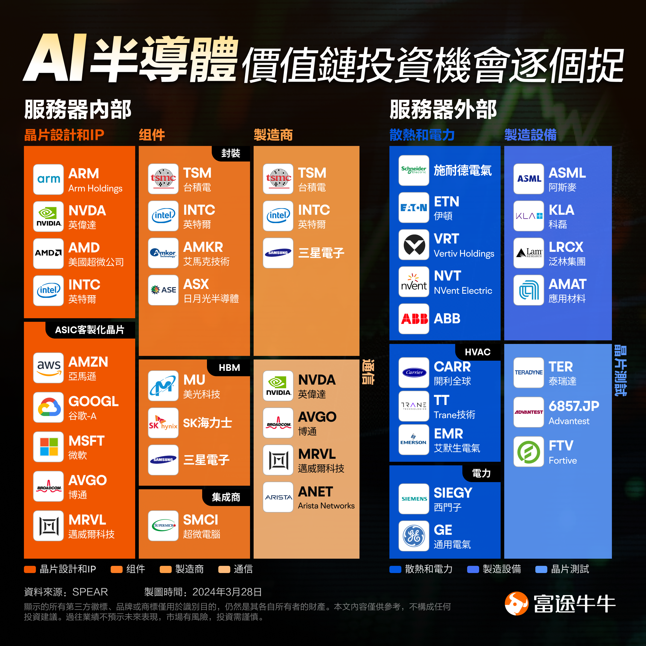 据SPEAR整理的“人工智能半导体价值链”,主要分为服务器内部和服务器外部,其中不乏有许多公司在默默起飞。