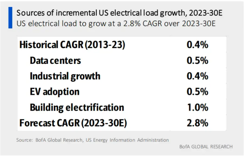 美银美林在最新发布的研报中表示,随着AI技术的飞速发展,美国电网的电力需求将面临着前所未有的增长,预计2023年至2030年,美国电力需求将以2.8%的年复合增长率(CAGR)增长。