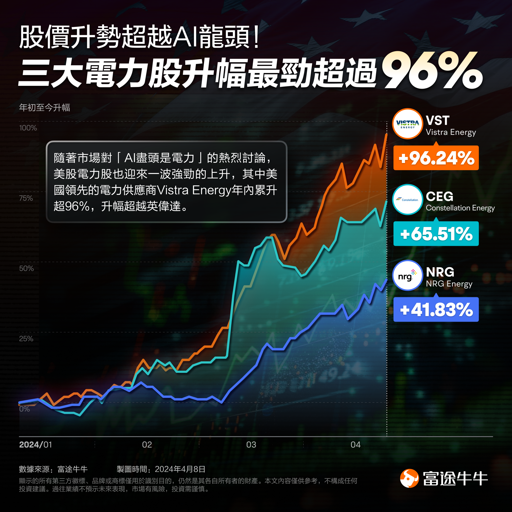 而从近期电力股表现来看,美国领先的电力供应商——$Vistra Energy (VST.US)$、美国最大的无碳核电巨头——$Constellation Energy (CEG.US)$、美国最大绿色电力公司$NRG Energy (NRG.US)$表现十分强劲,年内分别累涨超96%、65%、41%。