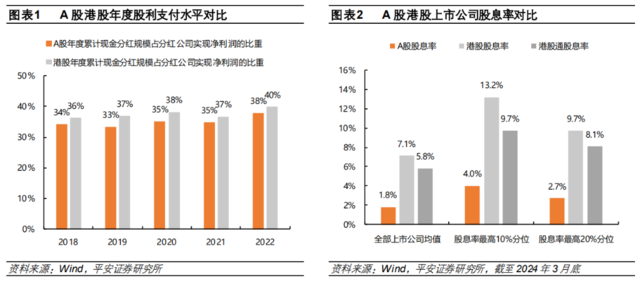 第一,整体分红水平方面,A 股上市公司整体现金分红比例小幅低于港股, 2022 财年分别为38%、40%。据wind数据,以2022财年分红为统计口径,A股2022财年有超3500家公司实施分红,年度累计分红总额占分红公司实现净利润总额的比重为38%,同期港股2022财年有超900家公司实施分红,年度累计分红总额占分红公司实现净利润总额的比重为40%;结构上,A股年度累计现金分红比例大于40%的公司数量占全部分红公司数量的比重为36%,同期港股为43%。